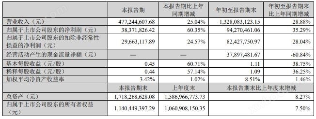 报告显示,第三季度,千味央厨实现营业收入4.77亿元,同比增长25.04%;归属于上市公司股东的净利润3738.18万元,同比增长60.35%;归属于上市公 司股东的扣除非经常性损益的净利润2966.31万元,同比增长24.57%;基本每股收益0.45元。