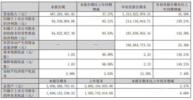 报告显示,第三季度,甘源食品实现营收4.87亿元,同比增长37.27%;归属于上市公司股东的净利润9454.00万元,同比增长95.31%;归属于上市公司股东扣除非经常性损益的净利润8462.29万元,同比增长93.63%。