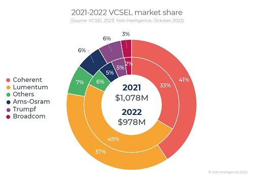 数据通信应用的VCSEL收入预计将在2028年达到2.32亿美元,2022年至2028年的复合年增长率为11%。对高带宽和低延迟通信的需求正在推动数据中心的发展。这与由于使用互联网进行社交网络和视频流而增加的带宽需求有关。其他市场也在蓬勃发展:汽车应用在激光雷达中使用VCSEL,工业应用在智能支付模块中使用VCSEL,尤其是在中国。