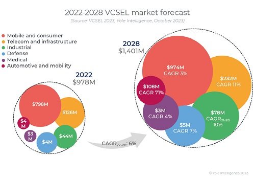 Yole预测,在消费者应用驱动下,全球VCSEL市场将从2022年的9.78亿美元增长到2028年的14亿美元,年复合增长率为6%。
