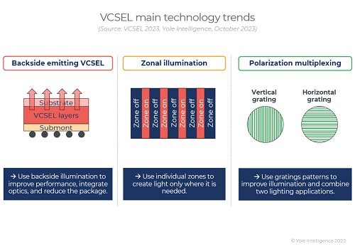 其他技术进步与减少VCSEL占用空间有关,同时保持输出功率和/或增加新功能:使用背面发射VCSEL在VCSEL上添加微光学,使用具有两个光栅方向的偏振复用,例如,在同一设备上组合泛光照明器和点投影仪。