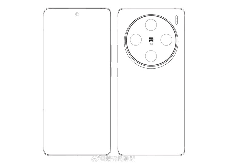 从图中可以看到,手机的摄像头Deco位于背面上方,采用的是奥利奥圆环四摄的方案,四颗摄像头在Deco中的上下左右对称排布,居中位置则是蔡司的小蓝标和T星镀膜标记,闪光灯则位于Deco外侧的右上角区域,Deco下方则是vivo与蔡司打造的影像系统的名称。