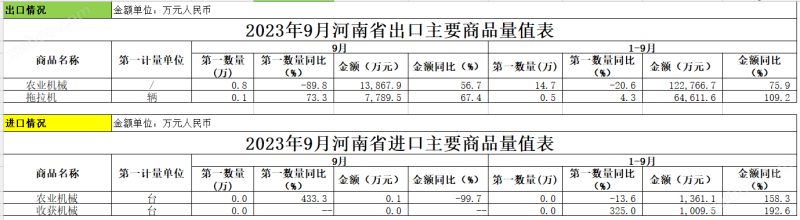 近日,郑州海关公布2023年9月河南省进出口主要商品量值表。其中农业机械方面进出口情况如下: