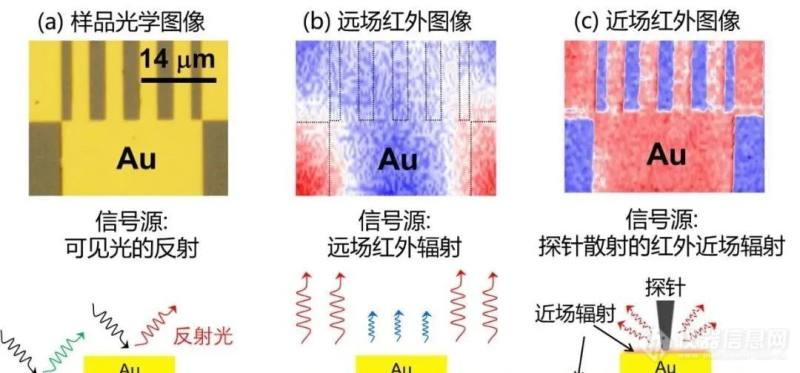 另外,值得注意的一点是,图3(c)所示的红外近场图像不仅仅在分辨率上有所提高,而且在金属与衬底的信号强度对比上出现了明显反转(由远场切换至近场后,Au由弱信号方(蓝色)转变为强信号方(红色))。针对上述现象的解释如下:远场成像时,Au是高反射物体,因此吸收红外光的能力极弱,根据基尔霍夫定律,则其红外发射率也很低。因而远场红外成像中其信号弱于衬底SiO2;而在近场成像中,室温金属(Au)中的自由电子存在剧烈的热运动(热噪声),从而在金属表面产生极强的表面电磁波,因而Au上的信号远强于SiO2。由此可见,SNoiM技术不仅突破了红外衍射极限限制,而且能够检测远场显微镜所无法探测的物理过程。