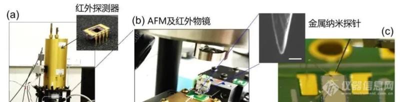 图2 红外被动近场显微镜SNoiM的实物图(a) 红外被动近场显微镜SNoiM的实物图,其中搭载了超高灵敏度红外探测器;(b)AFM及红外收集物镜;插图为通过电化学腐蚀制备的金属(钨)纳米探针;(c)探针与样品的显微照片