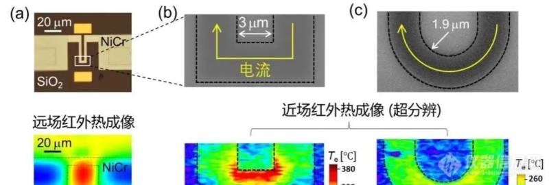 基于SNoiM技术的另一项创新与突破在于纳米尺度下通电器件中微观载流子输运及局域能量耗散的直接可视化。值得指出,SNoiM所检测的近场辐射信号来自于物体近表面的传导电子,因此其成像结果所反映的是物体表面的局域电子温度(Te)。目前仅SNoiM技术可实现纳米尺度下电子温度分布的直接成像。下面将以通电微小金属线(NiCr合金)为例进行说明。图4(a)为NiCr金属线的光学显微图像(上)及其通电后的红外远场热图像(下)。红外远场成像检测通电器件的远场辐射,从而估算出器件的表面温度。比如,器件中心处出现明显热斑,该处温度最高,表明电流流经微小弯曲金属线时能量耗散最大。而受衍射极限限制,远场红外热成像无法分辨微小金属线(宽度约3.3 μm)上不同区域的温度分布,因此无法有效反映微观尺度上载流子的能量耗散特性。与之相比,近场红外热成像则可清晰展示器件中心区域微观载流子的输运及能量耗散行为。如图4(b)所示,当电流经过器件凹形弯折区时,近场红外热成像下,该区域内存在极其不均匀的温度分布,而且在凹形内侧出现显著热斑。该现象表明,通电NiCr器件的凹形区内存在非均匀局部焦耳热,且内侧区域电子能量耗散最大,这是由于电流的拥挤效应所造成的。此外,该温度分布图像似乎表明,通电时,载流子倾向于避开直角拐角处,并趋于沿着U形路径分布。为验证这一猜想,该实验进一步设计了中心区域呈U形弯折的通电NiCr金属线,并对其进行了近场红外热成像表征。图4(c)显示,U形区域温度均匀分布,无明显局域热斑,这表明载流子倾向于沿着U形路径均匀输运。基于SNoiM纳米热分析研究而提出的新设计大大缓解了电流拥挤效应可能对器件造成的局部热损伤,具有重要的指导意义。