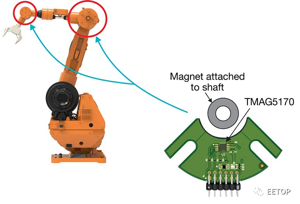 TMAG5170 是一款线性 3D 传感器,用于机械臂应用。