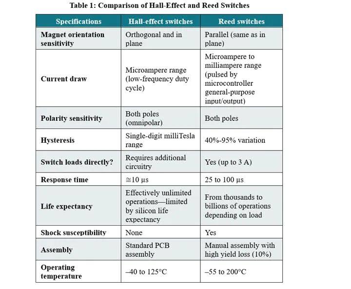 使用簧片开关的第二个主要缺点是它们无法使用标准的印刷电路板 (PCB) 组装程序。这些器件必须手工焊接到板上,从而使组装过程复杂化并增加成本。表 1比较了这两种技术。