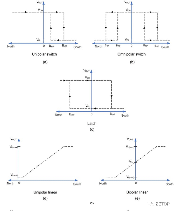 此图显示霍尔效应开关 (a) 和 (b)、锁存器 (c) 和线性传感器 (d) 和 (e) 输出响应。