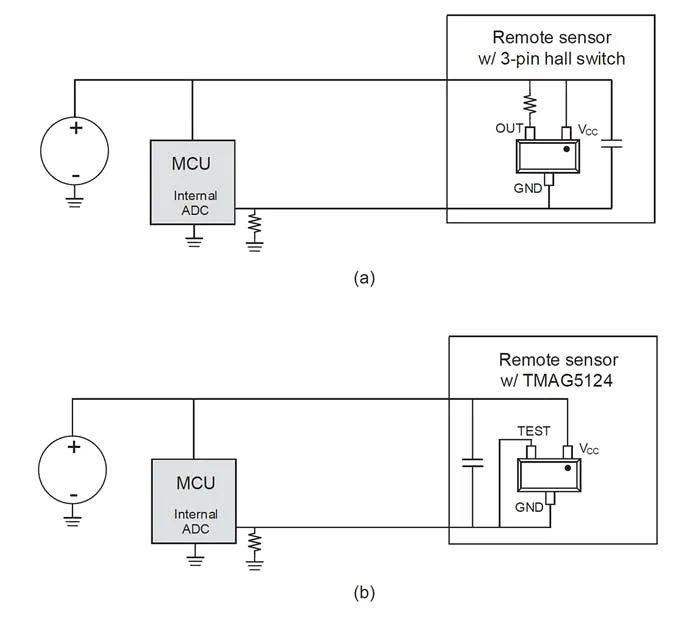图5. 使用电压输出霍尔效应开关 (a) 和电流输出 TMAG5124 (b) 的两线制遥感。