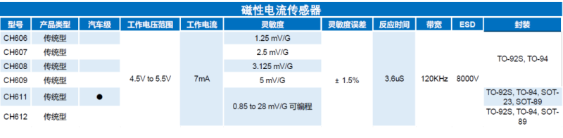 磁性电流传感器由精密、低失调的线性霍尔传感器电路组成,其输出电压与产生磁场的电流成正比。200A以上的应用,通常采用传统型采样方式,大电流穿过外加磁环。200A以下的应用, 现多采用单片集成型,大大节省了方案成本和体积。
