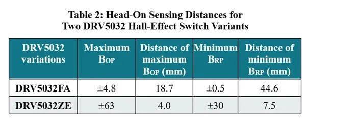 以 TI 的DRV5032 为例。表 2显示了使用小型低成本铁氧体磁铁 (12 × 12 × 6 mm) 提供的所有器件变体的正面感应距离。TI 的最低灵敏度 DRV5032ZE 可以检测 4.0 至 7.5 mm 的磁铁,而 DRV5032FA 版本的范围在 18.7 至 44.6 mm 之间。如果使用更坚固、尺寸相同的 52 级 NdFeB 磁体,该检测距离将增加到近 3 英寸。