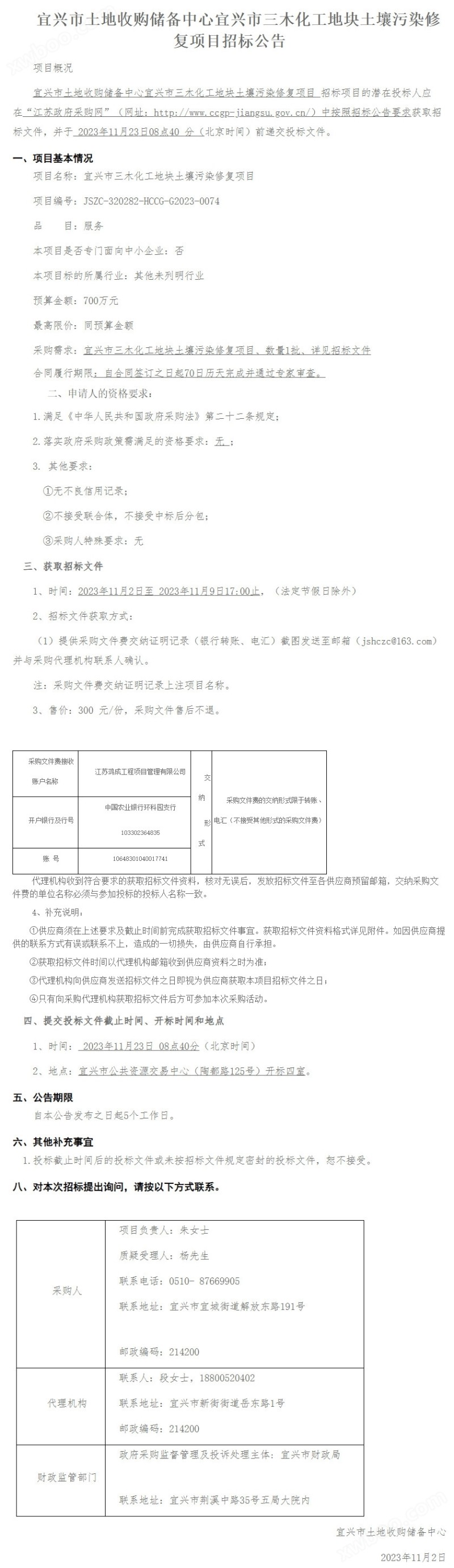 11月2日,江苏省宜兴市土地收购储备中心宜兴市三木化工地块土壤污染修复项目发布采购公告,预算金额700万元。开标时间为11月23日。详情如下: