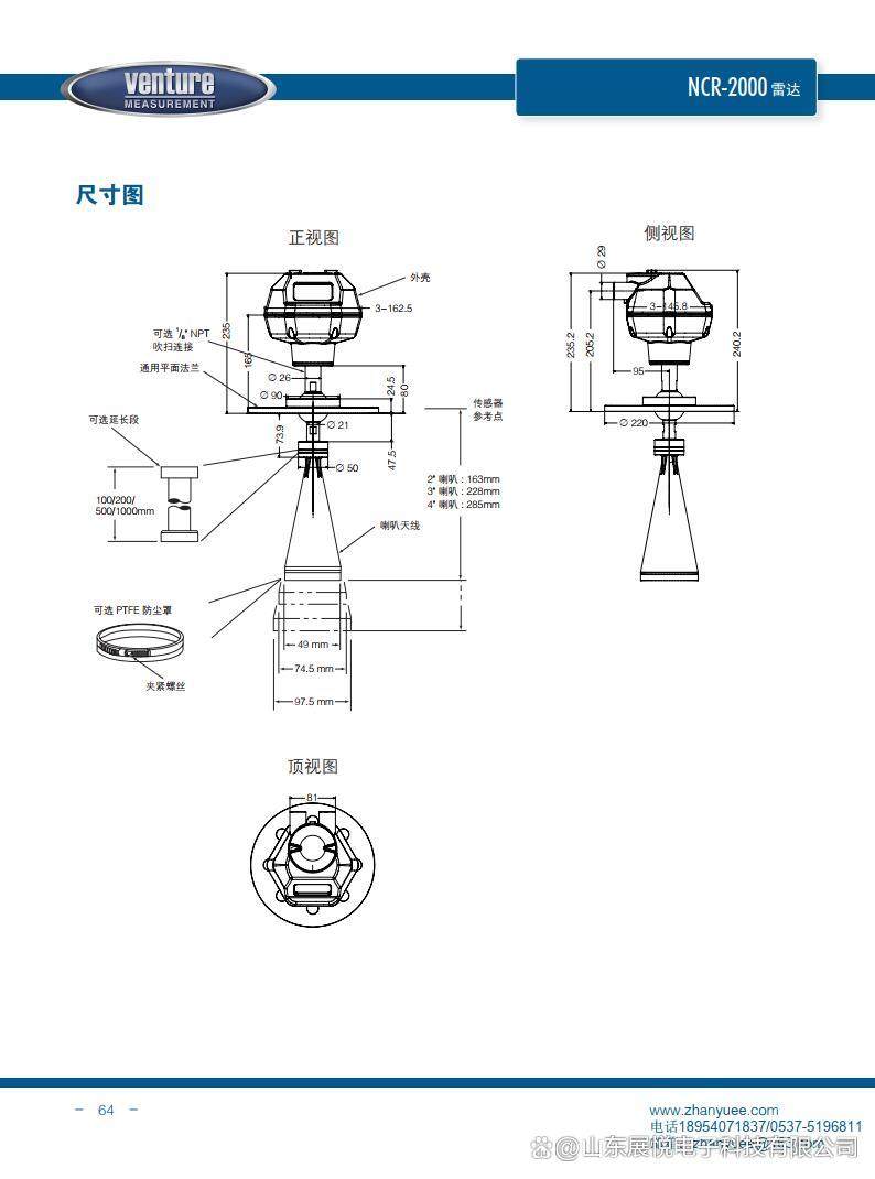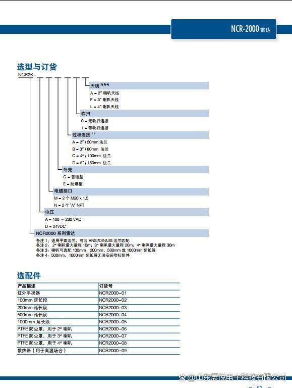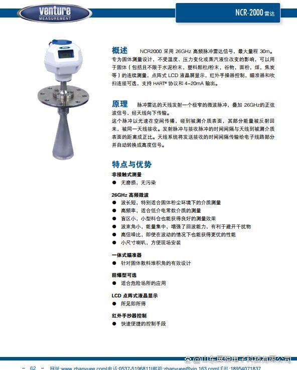 总之,NCR2000是一款功能强大、易于使用和维护的固体物位变送器。它采用26GHz高频脉冲雷达信号进行测量,具有快速、准确、可靠的特点;同时配备了点阵式LCD液晶屏显示和红外手操器控制功能,使得使用和维护更加方便。此外,它还支持4-20mA输出和瞄准器及吹扫连接可选,可以满足不同用户的需求。这些特点使得NCR2000成为固体和液位测量的理想选择。