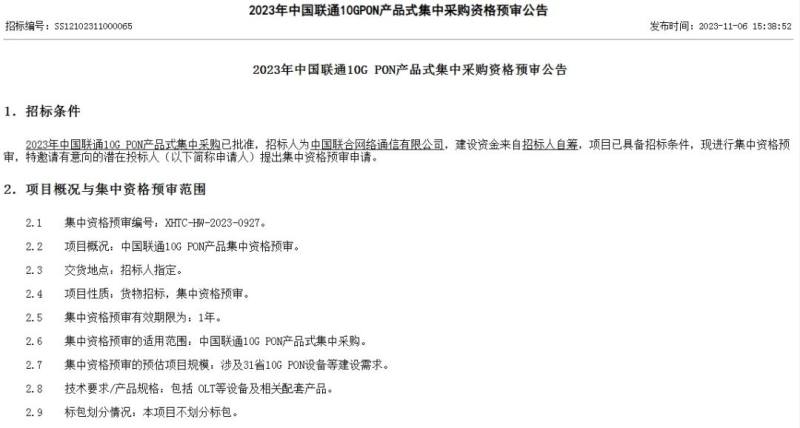 C114讯 11月8日消息(焦焦)从中国联通官网获悉,中国联通发布公告称,启动2023年10G PON产品式集中采购资格预审。