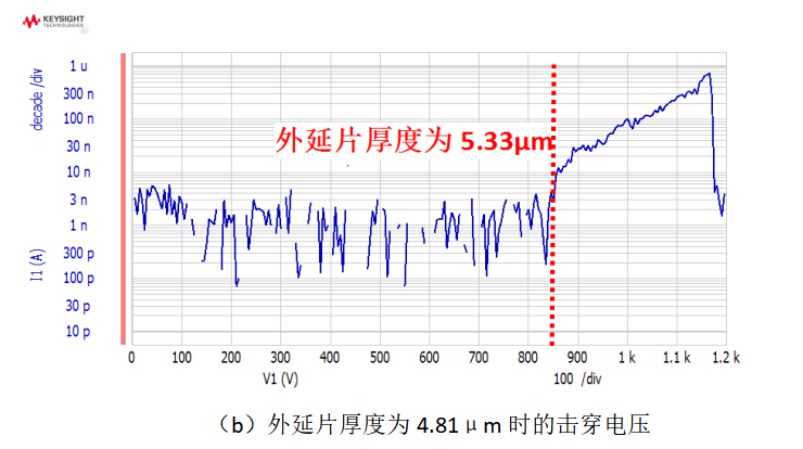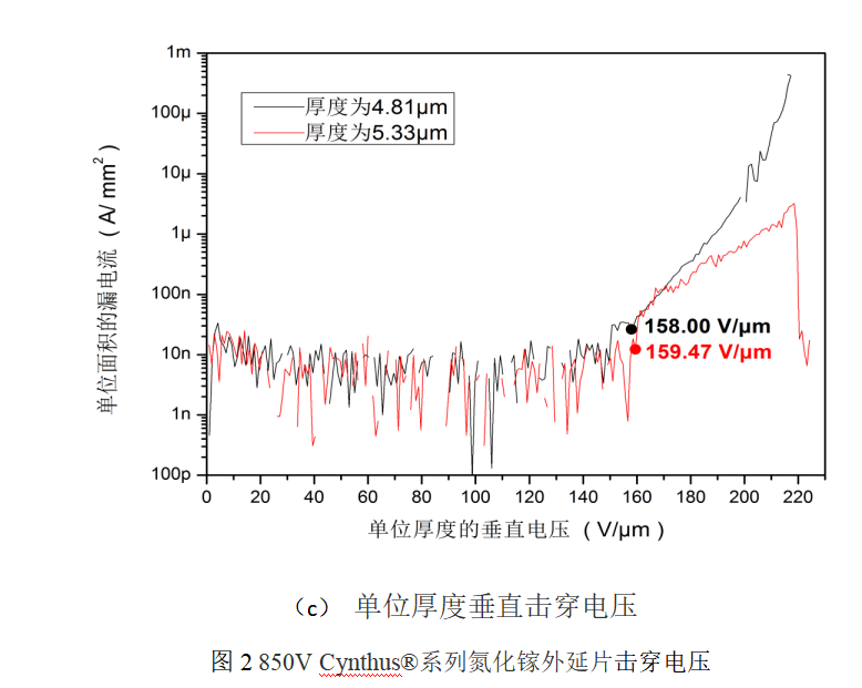 世界顶尖水平的耐压控制水平。通过芯生代通过关键技术的改进,可在外延层厚度仅为5.33μm即可实现850V的安全工作电压,实现了158V/μm单位厚度垂直击穿电压,误差小于1.5V/μm,即误差小于1%(图2(c)),处于世界顶尖水平。