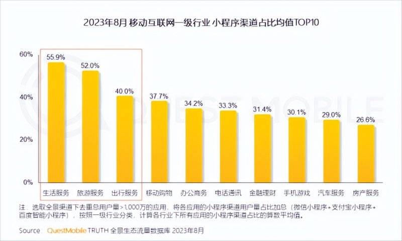 从QuestMobile发布的《2023全景生态流量秋季报告》也可以看出,2023年多领域消费复苏环境下,小程序承接激增的流量,吸引各个行业应用布局小程序以寻找增量。其中生活服务、旅游服务、出行服务行业更加依赖小程序渠道获客。