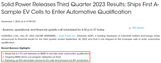 一年后,福特和宝马验证了Solid Power数百个生产线生产的电池单元,正式确定了Solid Power的商业合作计划。