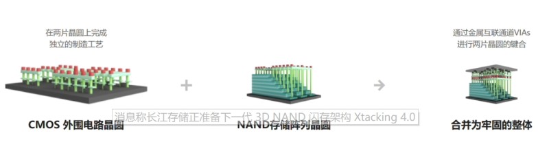 晶栈 Xtacking 是长江存储核心技术品牌,可实现在两片独立的晶圆上加工外围电路和存储单元,这样有利于选择更先进的逻辑工艺,从而让 NAND 获取更高的 I / O 接口速度及更多的操作功能。当两片晶圆各自完工后,晶栈 Xtacking 技术只需一个处理步骤即可通过数十亿根垂直互联通道(VIA)将两片晶圆键合,合二为一。