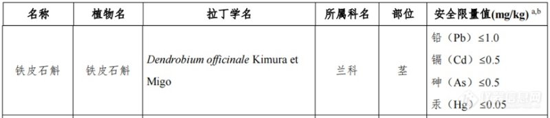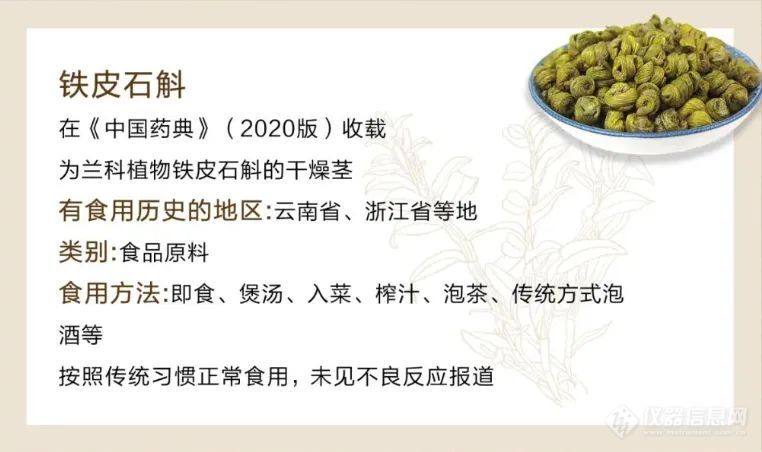 铁皮石斛。在《中国药典》(2020版)收载,为兰科植物铁皮石斛(Dendrobium officinale Kimura et Migo)的干燥茎。铁皮石斛在云南、浙江等省份有作为食品原料食用的历史,主要用于鲜食、煲汤、入菜、榨汁、泡茶、传统方式泡酒等。按照传统习惯正常食用,未见不良反应报道。