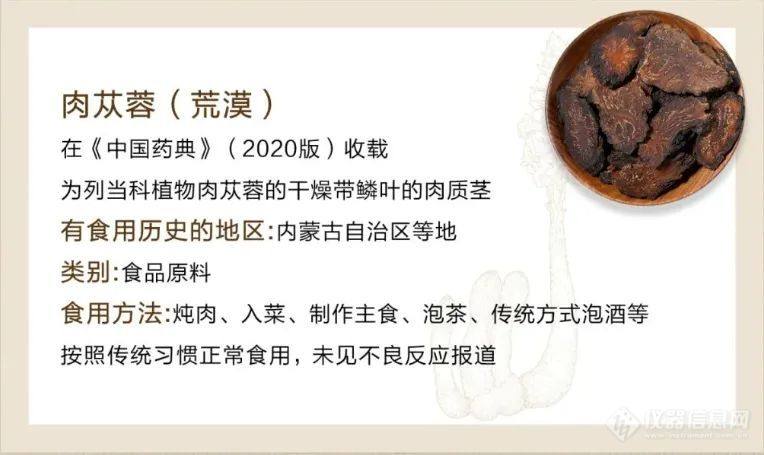 肉苁蓉(荒漠)。在《中国药典》(2020版)收载,为列当科植物肉苁蓉(Cistanche deserticola Y.C. Ma)的干燥带鳞叶的肉质茎。肉苁蓉(荒漠)在内蒙古等省份有作为食品原料食用的历史,主要用于炖肉、入菜、制作主食、泡茶、传统方式泡酒等。按照传统习惯正常食用,未见不良反应报道。