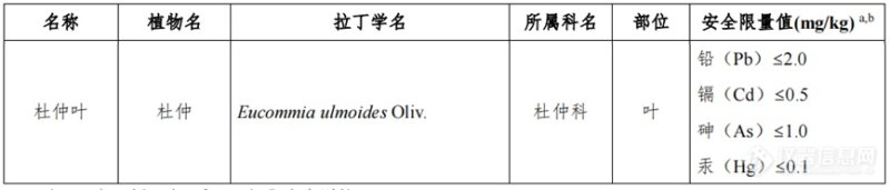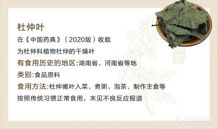 杜仲叶。在《中国药典》(2020版)收载,为杜仲科植物杜仲(Eucommia ulmoides Oliv.)的干燥叶。杜仲叶在湖南、河南等省份有作为食品原料食用的历史,主要用于入菜、煮粥、泡茶、制作主食等。按照传统习惯正常食用,未见不良反应报道。