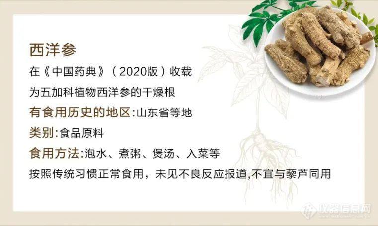 西洋参。在《中国药典》(2020版)收载,为五加科植物西洋参(Panax quinquefolium L.)的干燥根。西洋参在山东等省份有作为食品原料食用的历史,主要用于泡水、煮粥、煲汤、入菜等。按照传统习惯正常食用,未见不良反应报道。西洋参不宜与藜芦同用。