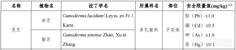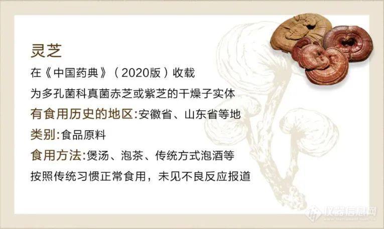 灵芝。在《中国药典》(2020版)收载,为多孔菌科真菌赤芝(Ganoderma lucidum(Leyss. ex Fr.)Karst.)或紫芝(Ganoderma sinense Zhao, Xu et Zhang)的干燥子实体。灵芝在安徽、山东等省份有作为食品原料食用的历史,主要用于煲汤、泡茶、传统方式泡酒等。按照传统习惯正常食用,未见不良反应报道。