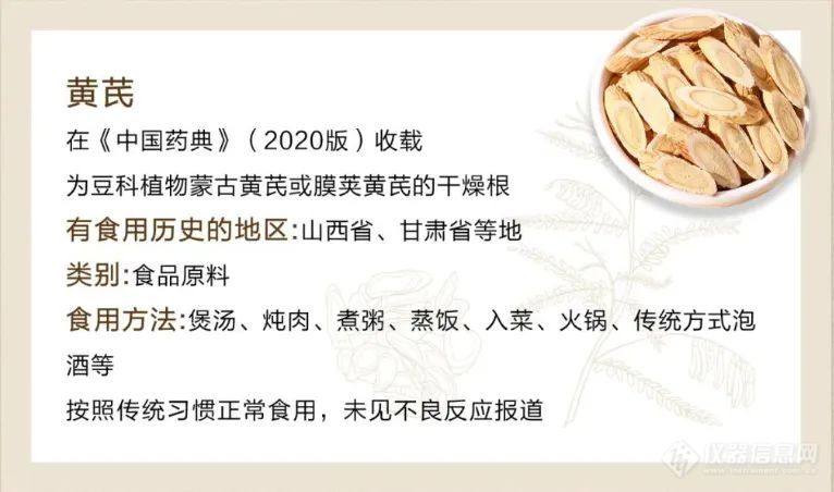 黄芪。在《中国药典》(2020版)收载,为豆科植物蒙古黄芪(Astragalus membranaceus (Fisch.) Bge.var. mongholicus (Bge.) Hsiao)或膜荚黄芪(Astragalus membranaceus (Fisch.) Bge.)的干燥根。黄芪在山西、甘肃等省份有作为食品原料食用的历史,主要用于煲汤、炖肉、煮粥、蒸饭、入菜、火锅、传统方式泡酒等。按照传统习惯正常食用,未见不良反应报道。