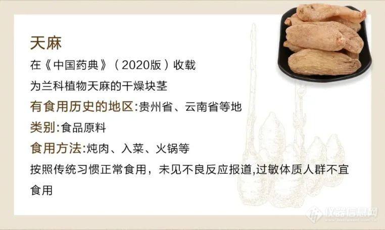 天麻。在《中国药典》(2020版)收载,为兰科植物天麻(Gastrodia elata Bl.)的干燥块茎。天麻在贵州、云南等省份有作为食品原料食用的历史,主要用于炖肉、入菜、火锅等。按照传统习惯正常食用,未见不良反应报道。过敏体质人群不宜食用。