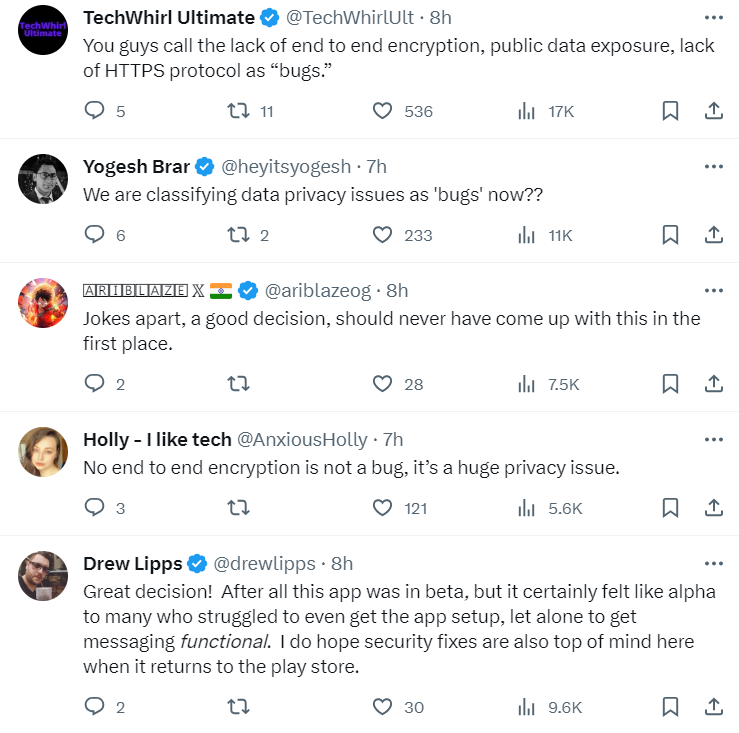 在 Nothing 的推文下很多用户并不买账,声称:“你们将缺乏端到端加密、公共数据暴露、缺乏 HTTPS 协议称为‘错误’。”“我们现在将数据隐私问题归类为‘错误’?”