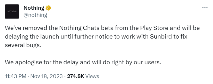 IT之家 11 月 19 日消息,手机厂商 Nothing 发文宣布,Nothing Chats 测试版已从 Google Play 商店下架,并表示“将推迟发布,直至另行通知,以便与 Sunbird 合作修复多个错误”。