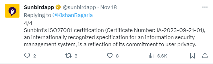 Sunbird 的 ISO27001 认证(证书编号:IA-2023-09-21-01)是国际公认的信息安全管理体系规范,体现了其对用户隐私的承诺。