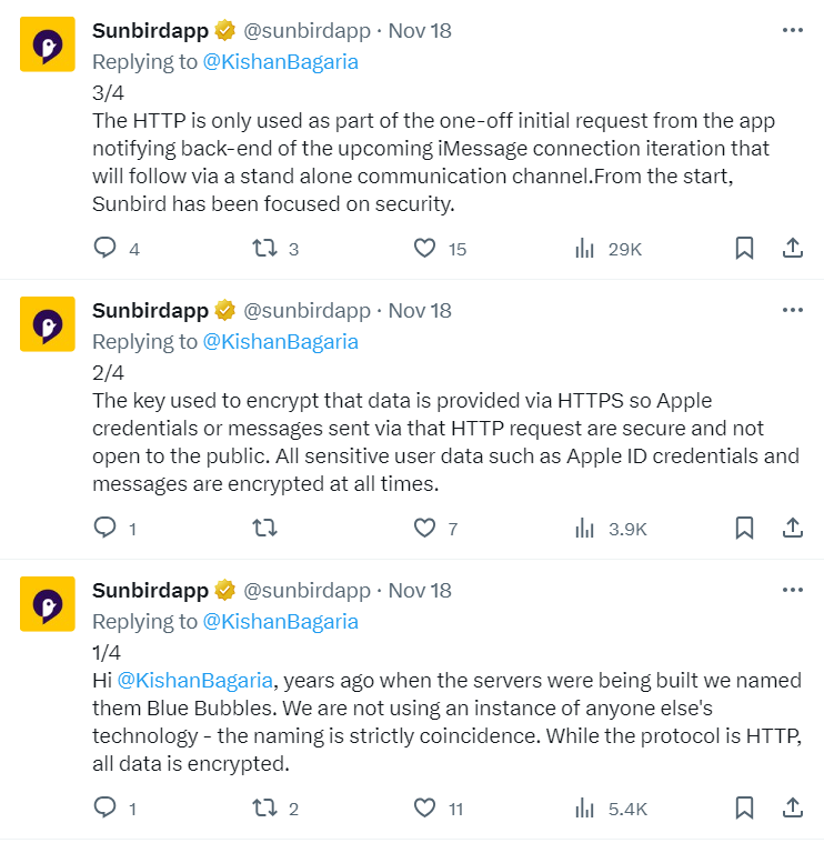Sunbird 的回应是否认任何安全问题,并证明其实施的合理性,加倍强调其安全性,“虽然协议是 HTTP,但所有数据都是加密的。”