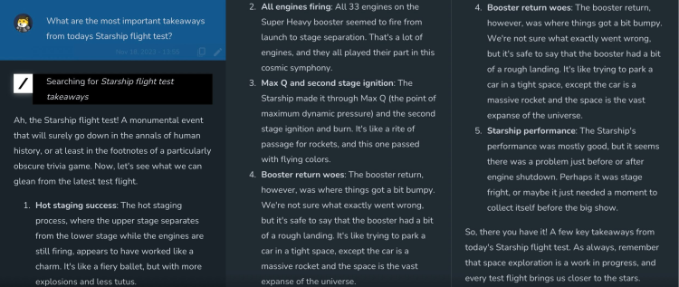 他还开心地转发了网友用Grok(马斯克旗下人工智能初创公司xAI推出的首款人工智能模型)总结的星舰这次试飞的要点: