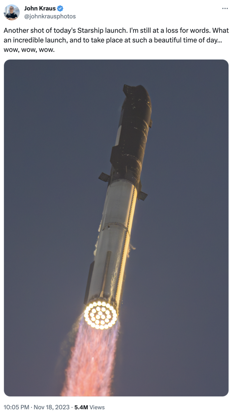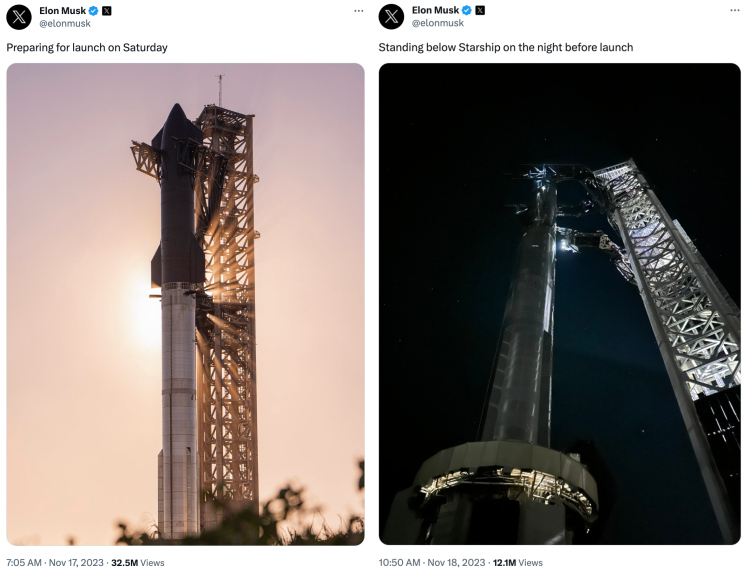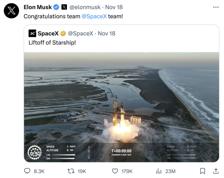 发射之前,SpaceX的老板马斯克在社交平台X为星舰再次升空已经连着做了几天宣传(这期间也发了不少关于评论时事和解释X的发展问题等等的动态)。
