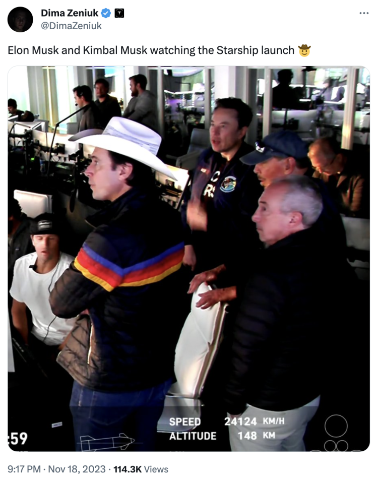马斯克和弟弟金巴尔·马斯克在现场一起看了星舰发射的全过程。