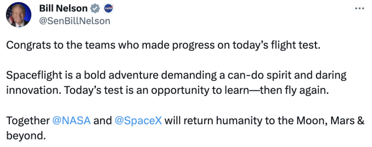 就连美国国家航空航天局局长Bill Nelson也给SpaceX发来贺电,祝贺星舰在第二次试飞中取得的进展: