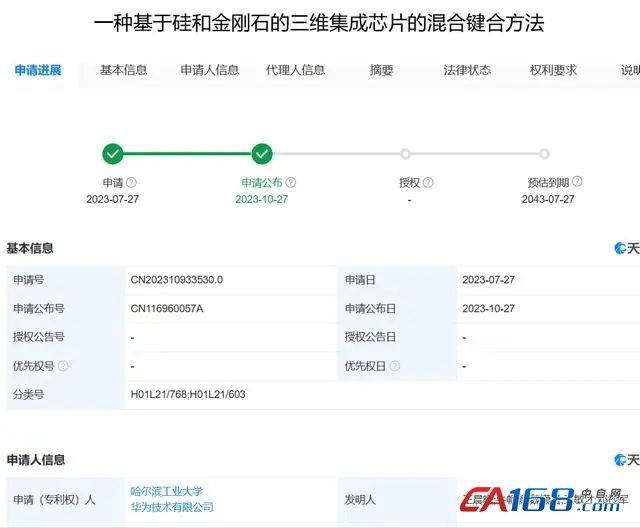 11月21日消息,据企查查显示,近日,华为技术有限公司、哈尔滨工业大学申请的“一种基于硅和金刚石的三维集成芯片的混合键合方法”专利公布。