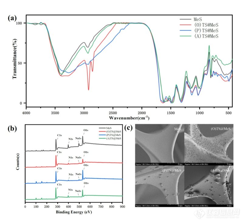图4 三聚氰胺海绵及硅烷化三聚氰胺海绵的FTIR图(a),XPS图(b)和SEM图(c)