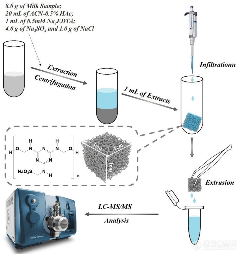 图2是将未经修饰的三聚氰胺海绵用于牛奶中兽药多残留分析。由于三聚氰胺海绵表面的亲疏水性基团以及较大的比表面积,提取液可自发渗透到其众多海绵微孔中,并且拥有极高的基质吸附效率。此外,其良好的机械性能和弹性使其可以通过物理挤压的方式快速方便地去除粗提溶液中干扰基质。只需使用三聚氰胺海绵直接汲取提取液,然后通过物理挤出即可轻松获得净化液,用于后续的LC-MS/MS分析。