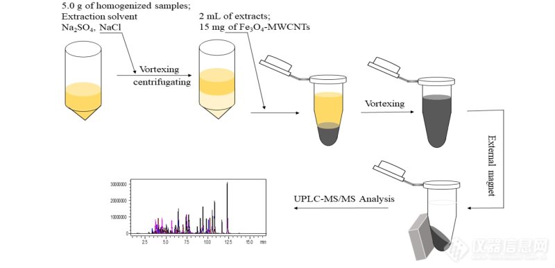 图1是将合成的磁性多壁碳纳米管用于鸡蛋中兽药多残留分析的具体分析流程,仅采用外部磁场的作用即可实现净化材料与提取液的分离,通过对盐析条件和提取液PH值的优化选择了合适的提取条件,然后又与其他几种常用净化材料进行对比,并优化磁性碳纳米管的用量,证明了磁性碳纳米管的优势,方法不仅大大缩短了样品前处理时间而且解决了多壁碳纳米管回收困难、回收率低的问题。