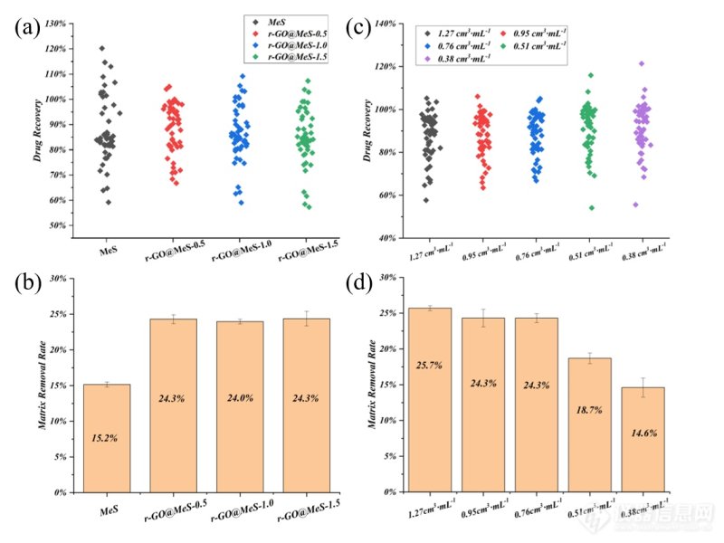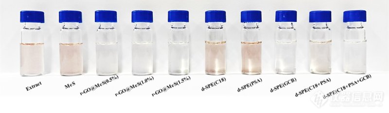 接下来,使用三种不同浓度氧化石墨烯(0.5,1.0,1.5 mg·mL-1)改性海绵用于粗提液的净化。又比较不同净化材料获得的药物回收率和基质吸附性能和净化除色效果。通过比较原始海绵与改性海绵净化后萃取液的颜色,发现使用rGO@MeS净化后的提取液澄清且透亮。为了进一步验证和比较上述材料的基质净化效果,考察了不同改性海绵对兽药回收率及其分布的影响。