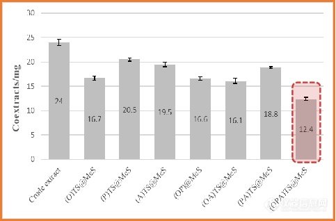 将7种不同的改性海绵用于粗提液的净化。大部分药物回收率处于可接受的60%-120%范围内,表明它们适合于去除鸡蛋中的基质干扰。通过对净化后基质去除率研究上述改性海绵的净化效率发现不同改性海绵在去除基质效率方面存在显著差异,如图5所示。