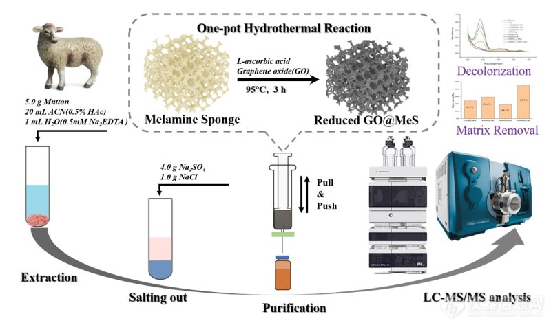 图6是将rGO@MeS用于羊肉中兽药多残留分析的具体流程。为了考察三聚氰胺海绵作为基质净化材料在肉类制品中的适用性,首先选择脂肪和蛋白质含量较高的羊肉作为实验对象用于方法开发,并以氧化石墨烯作为功能单体用于三聚氰胺海绵的改性。与原始海绵相比,rGO@MeS的直接变化就是海绵本身的颜色变化。通过透射电镜也观察到明显的表面微观形貌变化。这些都表明石墨烯成功键合到海绵骨架表面。