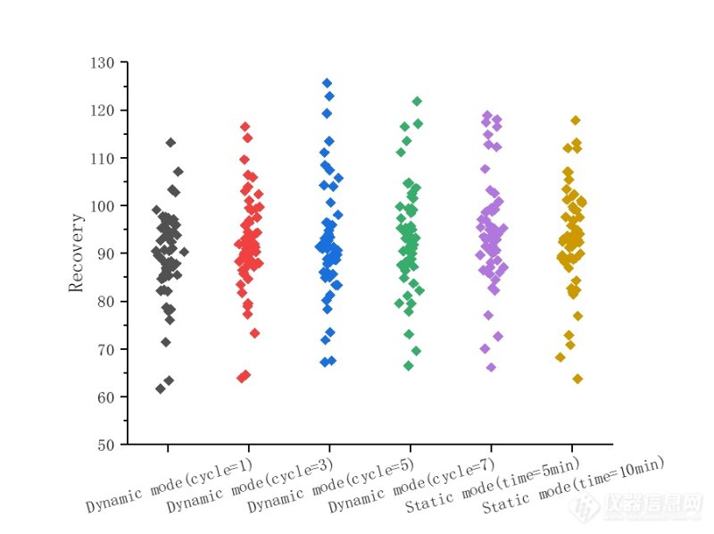 然后又对净化模式进行了比较。三聚氰胺海绵具有良好的弹性和机械性能,能够通过动态净化和静态净化两种方式实现基质的净化过程。在动态模式下,通过快速拉动和推动注射器的柱塞杆,将粗提液反复吸进和挤出海绵。在静态模式下,提取溶液自发地渗入海绵微孔并被保留,直到吸附过程结束。鉴于动态和静态模式海绵表面和提取溶液中干扰基质的吸附和迁移存在差异,考察了不同动态净化模式和静态净化模式对三聚氰胺海绵净化性能的影响,见图3。