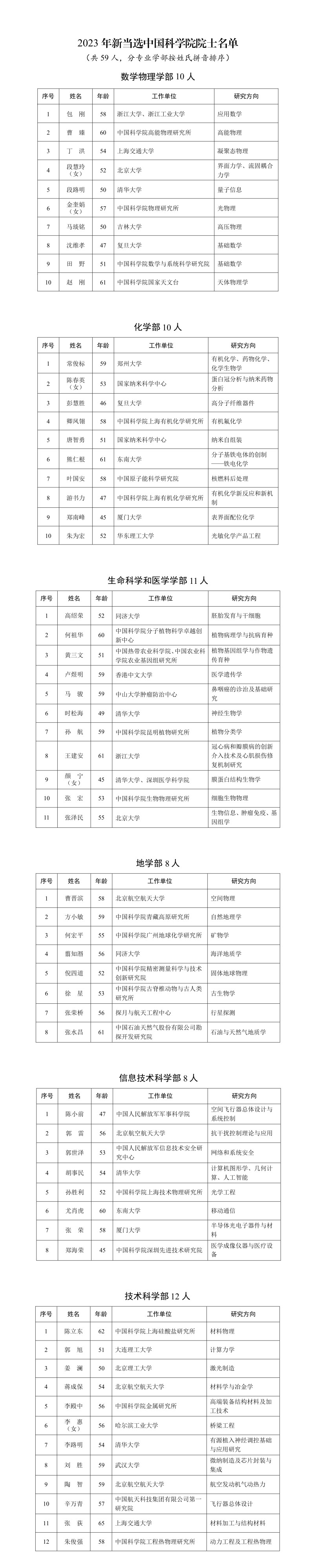 根据《中国科学院院士章程》《中国科学院院士增选工作实施办法(试行)》等规定,2023年中国科学院选举产生了59名中国科学院院士。