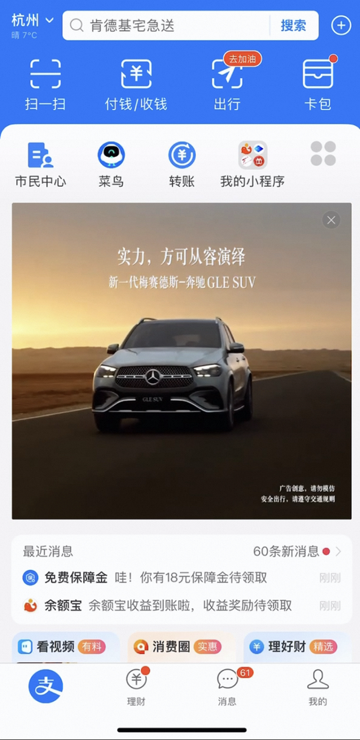 支付宝的商业化正在提速。近期,不少用户发现,支付宝App首页弹出大屏视频广告。据观察,奔驰,Rio等不同类别的品牌成为试水者,在支付宝App进行了各种形式的广告投放。此前,支付宝的支付成功页面还出现了苹果iPhone15新机的推广广告。