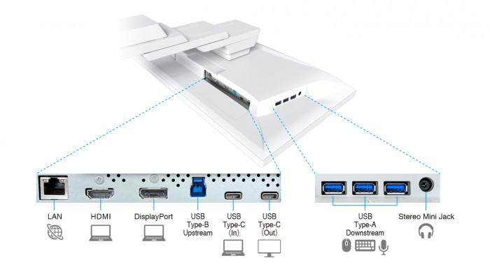 如上图所示,FlexScan EV2490 不仅提供了常见的 HDMI + DisplayPort + USB-C + 立体声耳机输出,还提供了一个 USB Type-B 上行口 —— 支持 1 × USB-C + 3 × USB-A 下行 + 有线以太网。