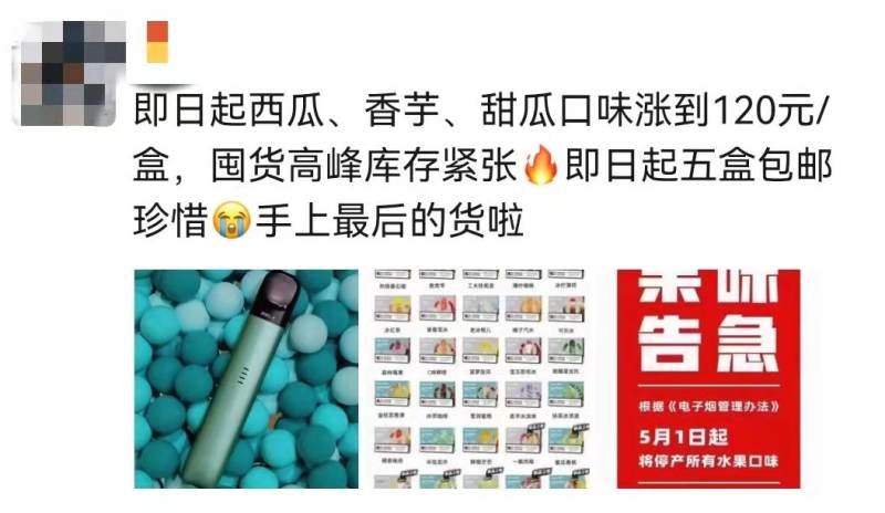 3月11日,国家烟草专卖局发布《电子烟管理办法》公告,5月1日起,不应使产品特征风味呈现除烟草外的其他风味。此后,电子烟果味烟弹的价格水涨船高。